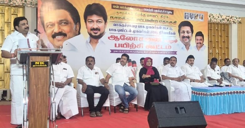 நாமக்கல்லில் கிழக்கு மாவட்ட திமுக சார்பில், நாமக்கல் சட்யசபை தொகுதி பூத் ஏஜெண்டுகளுக்கான ஆ@லசனைக் கூட்டம் நடைபெற்றது. கூட்டத்திற்கு, தமிழக ஆதி திராவிடர் நலத்துறை அமைச்சர் மதிவேந்தன், எம்எல்ஏ ராமலிங்கம் ஆகியோர் முன்னிலை வகித்தனர்.