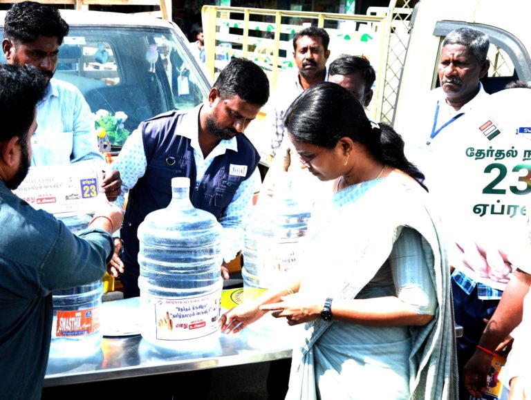 சட்டசபை தேர்தலில் 100 சதவீம் வாக்குப்பதிவை வலியுறுத்தி குடிநீர் கேன்களில் விழிப்புணர்வு ஸ்டிக்கர்
