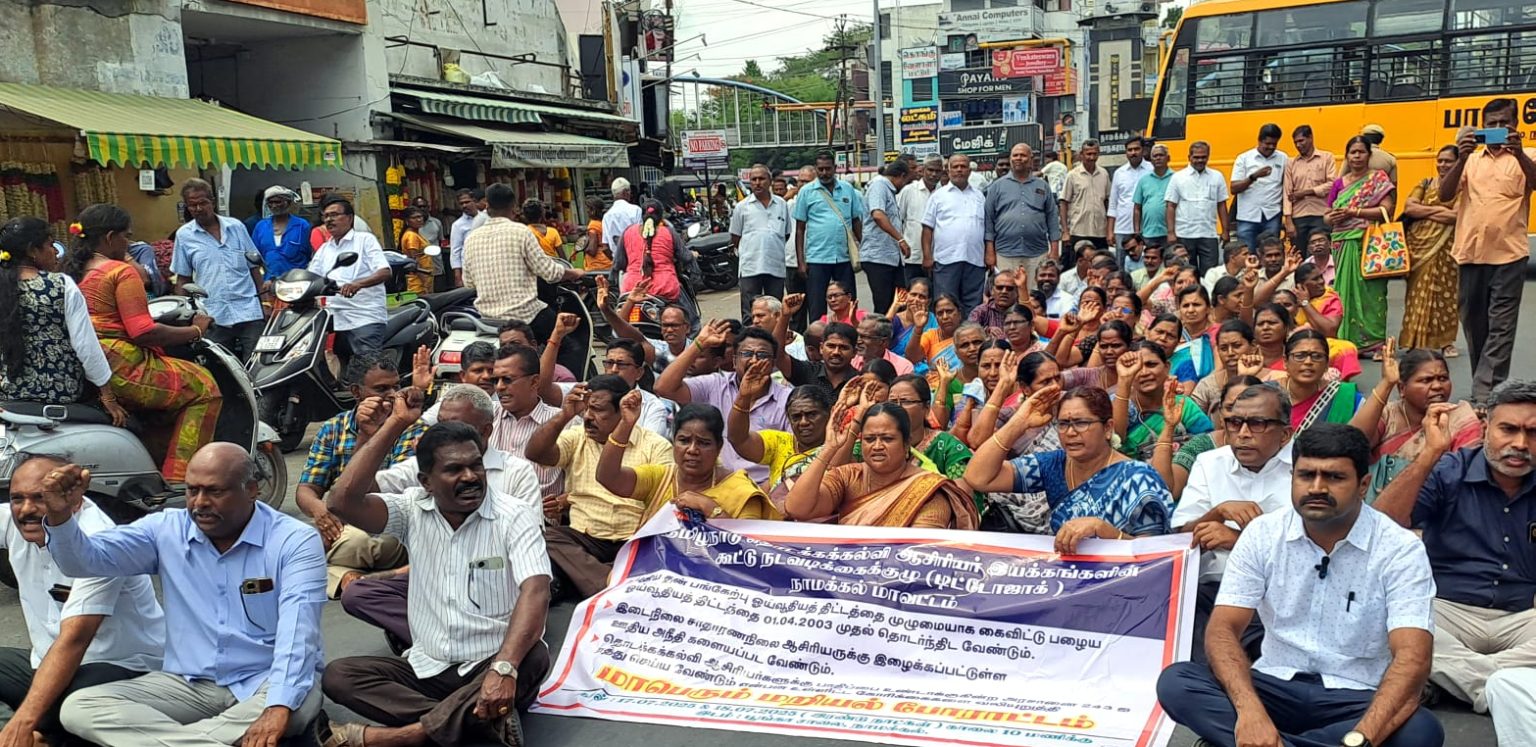 கடந்த 17ம் தேதி மாவட்டம் முழுவதும் சுமார் 500 ஆசிரியர்கள் தற்செயல் விடுப்பு எடுத்தனர். பின்னர், கோரிக்கைளை வலியுறுத்தி, டிட்டோஜாக் அமைப்பின் சார்பில், நாமக்கல் பார்க் ரோட்டில் கோரிக்கை விளக்க ஆர்ப்பாட்டம் நடைபெற்றது. தொடர்ந்து, மணிக்கூண்டு அருகில் சாலை மறியல் போராட்டம் நடைபெற்றது. இன்று 2வது நாளாக நாமக்கல் பழைய பஸ் ஸ்டாண்ட் அருகில் தொடக்கப்பள்ளி ஆசிரியர்களின் ஆர்ப்பாட்டம் மற்றும் சாலை மறியல் போராட்டம் நடைபெற்றது.