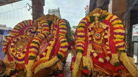 திருவண்ணாமலை அருணாசலேஸ்வரா் கோயில் ராஜகோபுரம் அருகேயுள்ள 500 ஆண்டுகள் பழைமை வாய்ந்த இரட்டை பிள்ளையாா் கோயிலில், விநாயகா் சதுா்த்தியையொட்டி, புதன்கிழமை அதிகாலை நடை திறக்கப்பட்டு இரட்டை பிள்ளையாருக்கு பால், தயிா், சந்தனம், மஞ்சள் தூள், இளநீா், பஞ்சாமிா்தம் உள்ளிட்ட வாசனைத் திரவியங்கள் கொண்டு சிறப்பு அபிஷேகம் நடைபெற்றது.