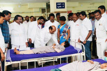 சிகிச்சை பெற்று வரும் குழந்தைகளை தமிழ்நாடு பொதுப்பணிகள் மற்றும் நெடுஞ்சாலைகள் துறை அமைச்சர் எ.வ.வேலு நேரில் சந்தித்து பழங்கள் அடங்கிய கூடையை வழங்கி குழந்தைகளுக்கு ஆறுதல் கூறினார் . தொடர்ந்து குழந்தைகளுக்கு அளிக்கப்பட்டு வரும் மருத்துவ சிகிச்சை குறித்து மருத்துவர்களிடம் கேட்டு அறிந்தார்.