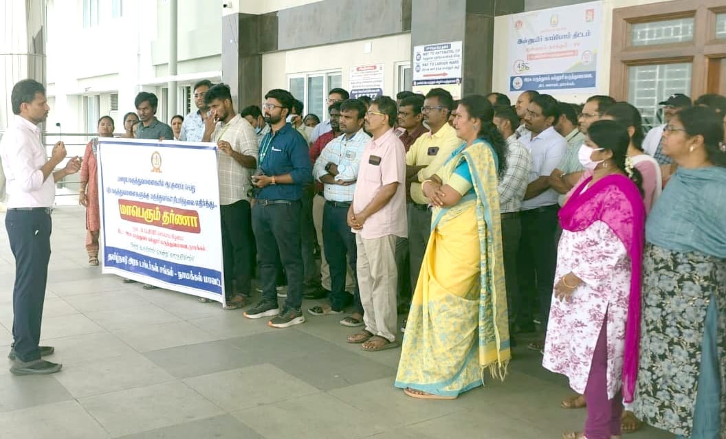 அரசு மருத்துவமனைகளில் மருத்துவர் பணியிடங்களில் ஆட்குறைப்பு செய்யும் நடவடிக்கையை கைவிட வலியுறுத்தி நாமக்கல் அரசு மருத்துவக் கல்லூரி மருத்துவமனை முன்பு தமிழ்நாடு அரசு மருத்துவர் சங்கத்தினர் ஆர்ப்பாட்டத்தில் ஈடுபட்டனர்.