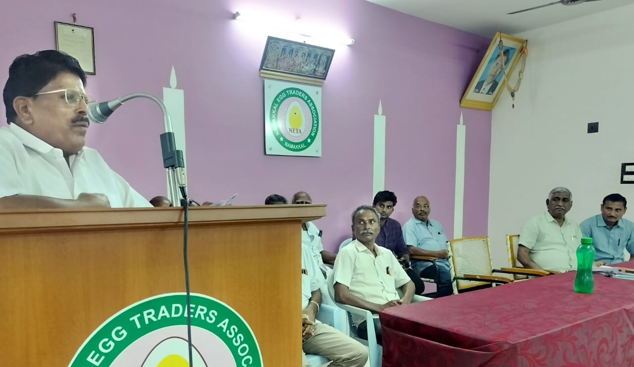நாமக்கல்லில் நடைபெற்ற முட்டை வியாபாரிகள் சங்க ஆலோசனைக் கூட்டத்தில், அதன் தலைவர் ஆனந்தன் பேசினார்.