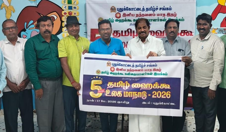 புதுக்கோட்டை. பிப்.07. புதுக்கோட்டைத் தமிழ்ச் சங்கம், ‘இனிய நந்தவனம்’ இதழ், தமிழ் ஹைக்கூ கவிதையாளர்கள் இயக்கம் இணைந்து நடத்தும் ‘தமிழ் ஹைக்கூ: ஐந்தாவது உலக மாநாடு – 2026’ வரும் மே 17 அன்று புதுக்கோட்டையில் நடத்துவதாக திருக்கோகர்ணம் ஸ்ரீவெங்கடேஸ்வரா மெட்ரிகுலேசன் மேனிலைப்பள்ளி வளாகத்தில் நடைபெற்ற வரவேற்புக் குழு அமைப்புக் கூட்டத்தில் முடிவெடுக்கப்பட்டது.